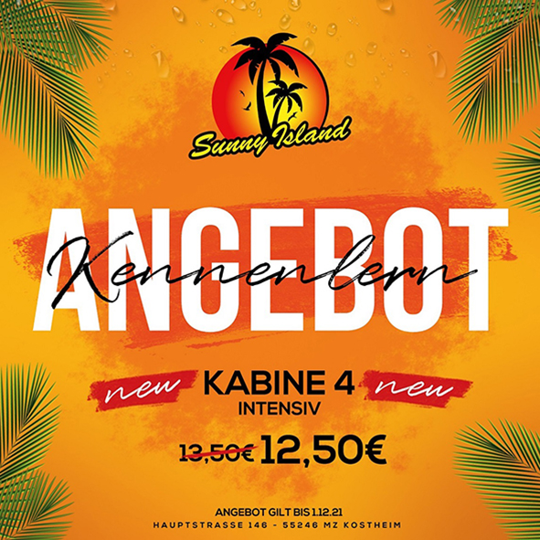 Okt. 27, 2021 - Dez. 1, 2021 Kennenlern-Angebot Sunny Island Hauptstraße 146, 55246 Mainz-Kostheim NEUE KABINE NR.4 - INTENSIV statt 13,50€, nur noch 12,50€